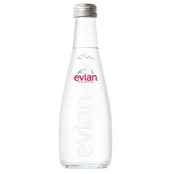 330 ml glass bottle of cold Evian water.