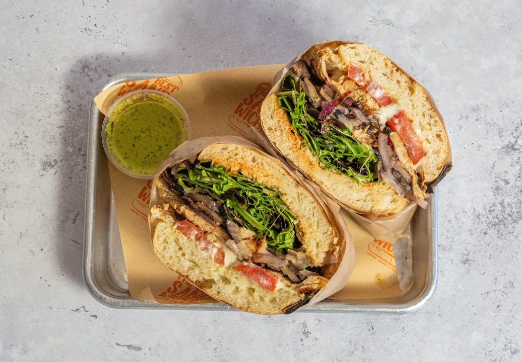 Superior USDA Choice Angus house marinated roast beef, Grilled portobellos, Organic Mix Lettuce, Fresh Tomatoes, Grilled Onions, Cheese, Mayo and Tomatina Sauce on Ciabatta Bread.